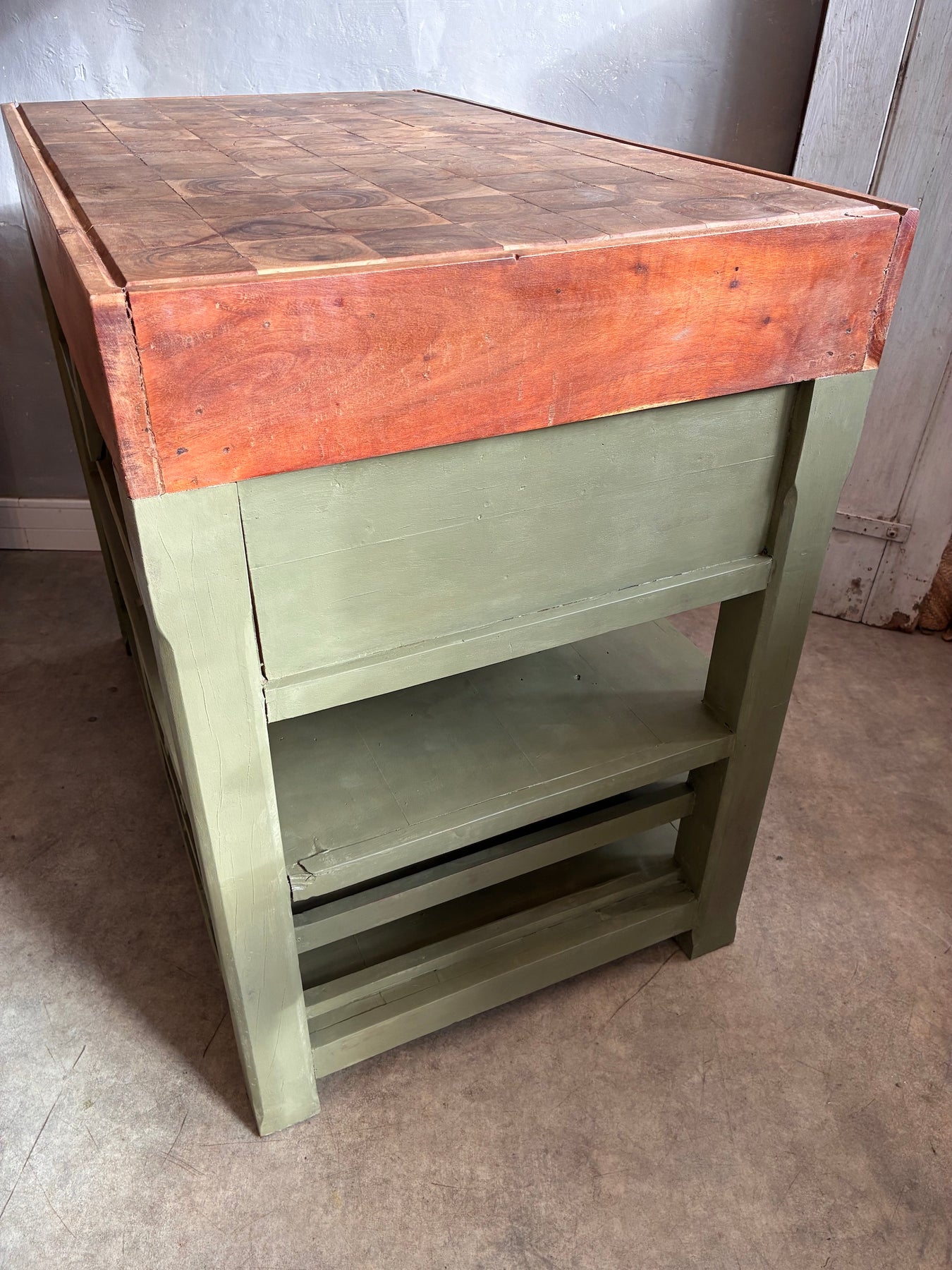Butcher Block Kitchen Island - Olive Green with a stunning butcher block top made from hardwood.