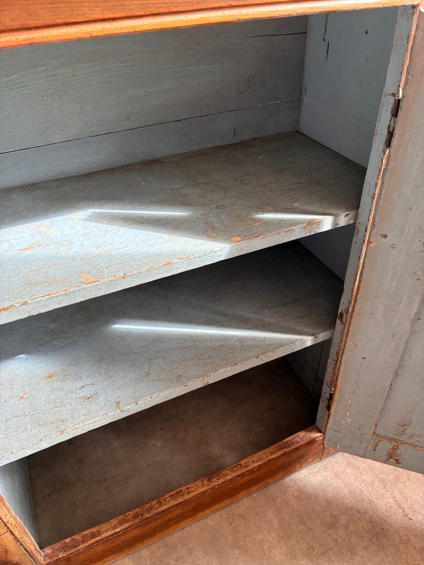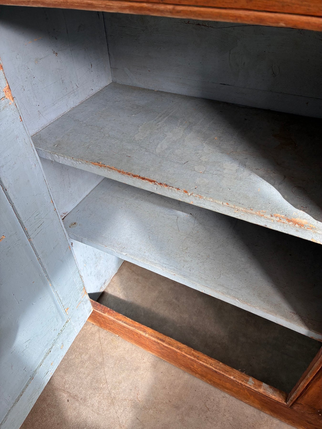The dresser is topped with a plate rack featuring two shelves, perfect for displaying your favourite dishes. Inside, the original blue paint creates a subtle, nostalgic touch. Ideal for adding warmth and functionality to any rustic space.