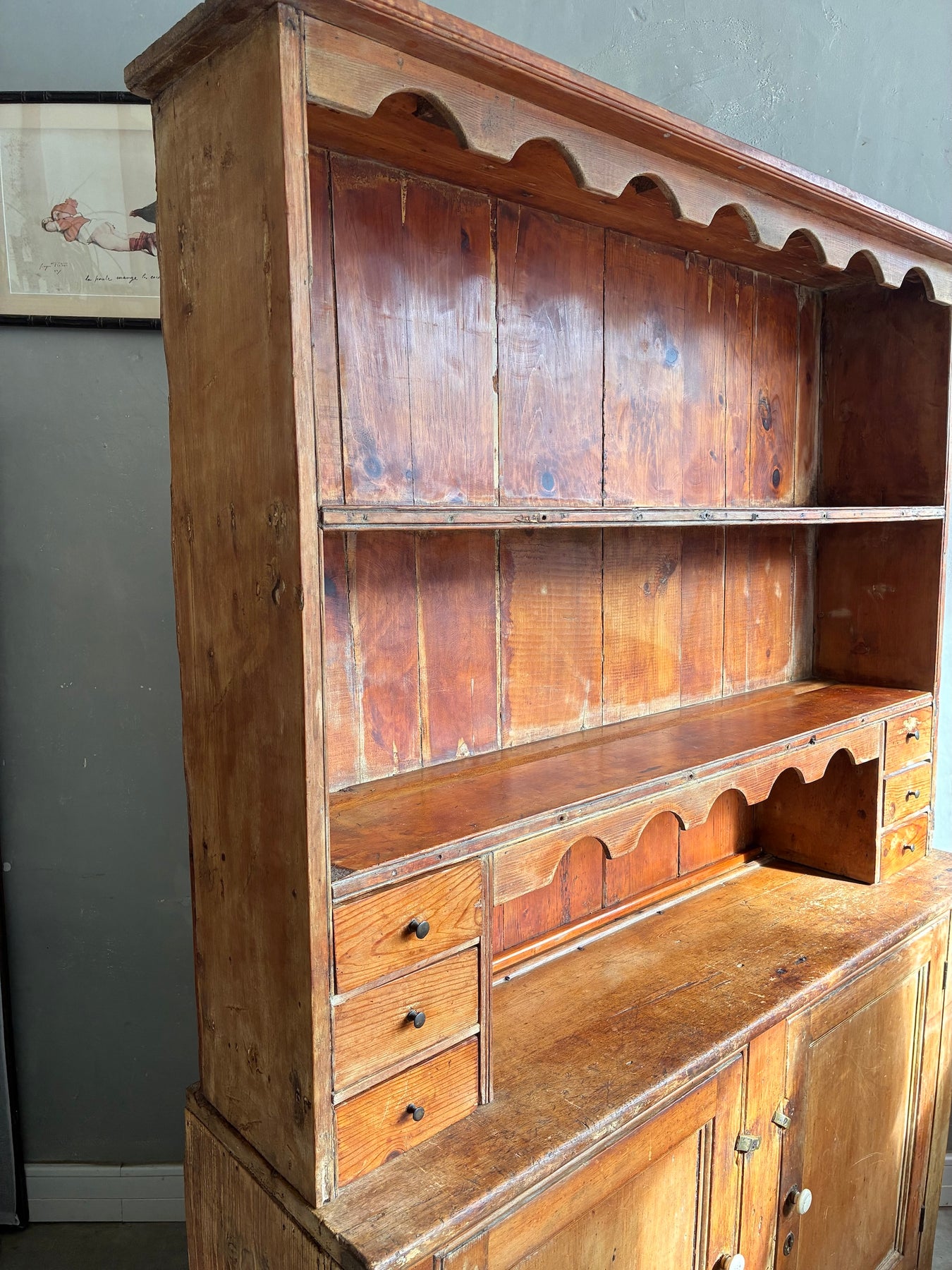 This old pine piece has seen plenty of use and wear; showing in knocks and marks in the wood. The corners of the cupboard have been sanded to remove scratches and the interior does not have a wooden base but sits directly on the floor. At some point in its long life (c1880) it has had extra boarding added to the rear to fill what would have been a gap where the dresser top sits on the base. Perfect for those who are looking for that authentic primitive look for their home.