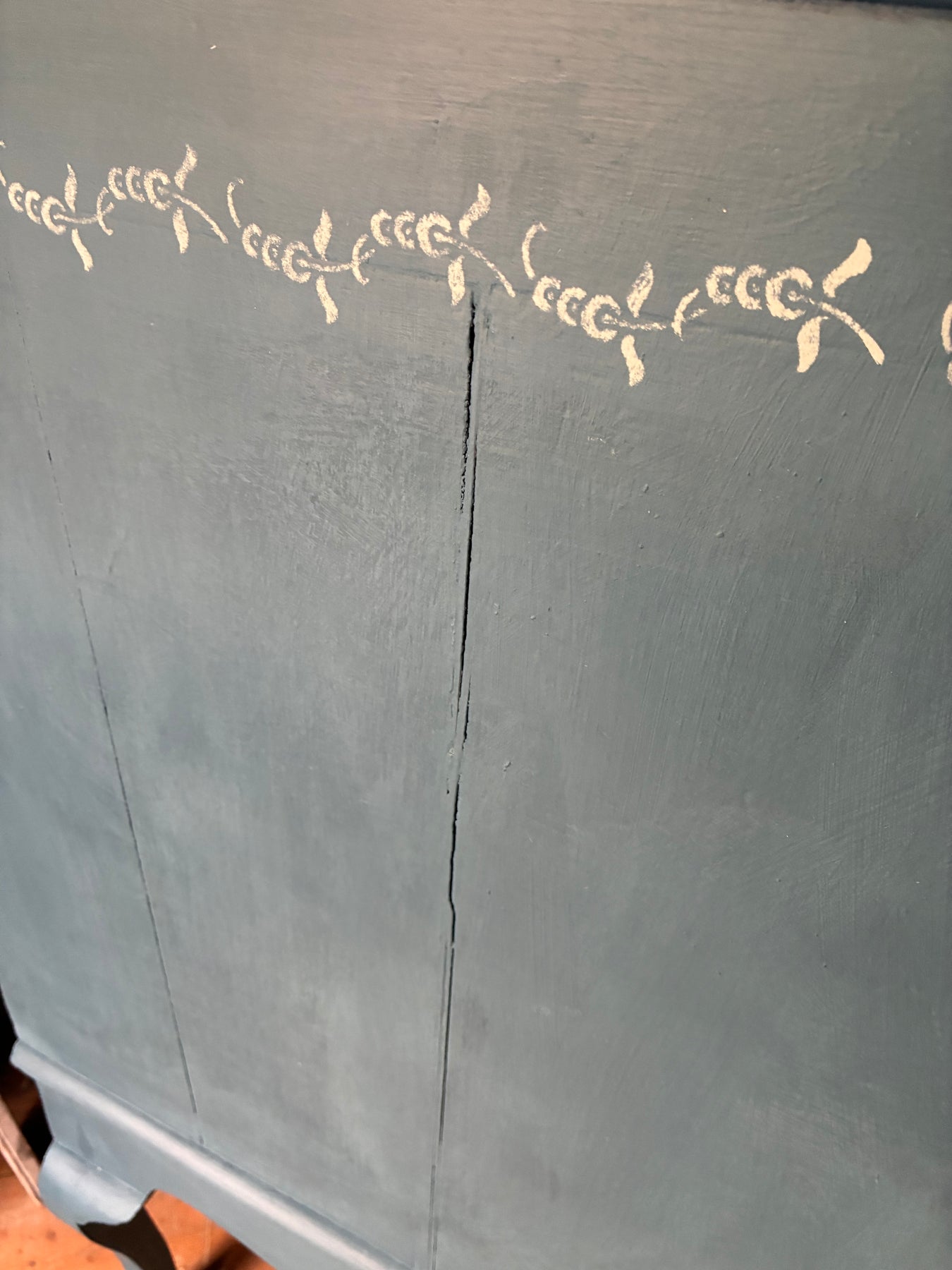 Raised on graceful cabriole legs, the piece features delicate duck egg blue detailing on the carving on the plinth and matching stencilling around the top—details that showcase its character and craftsmanship.