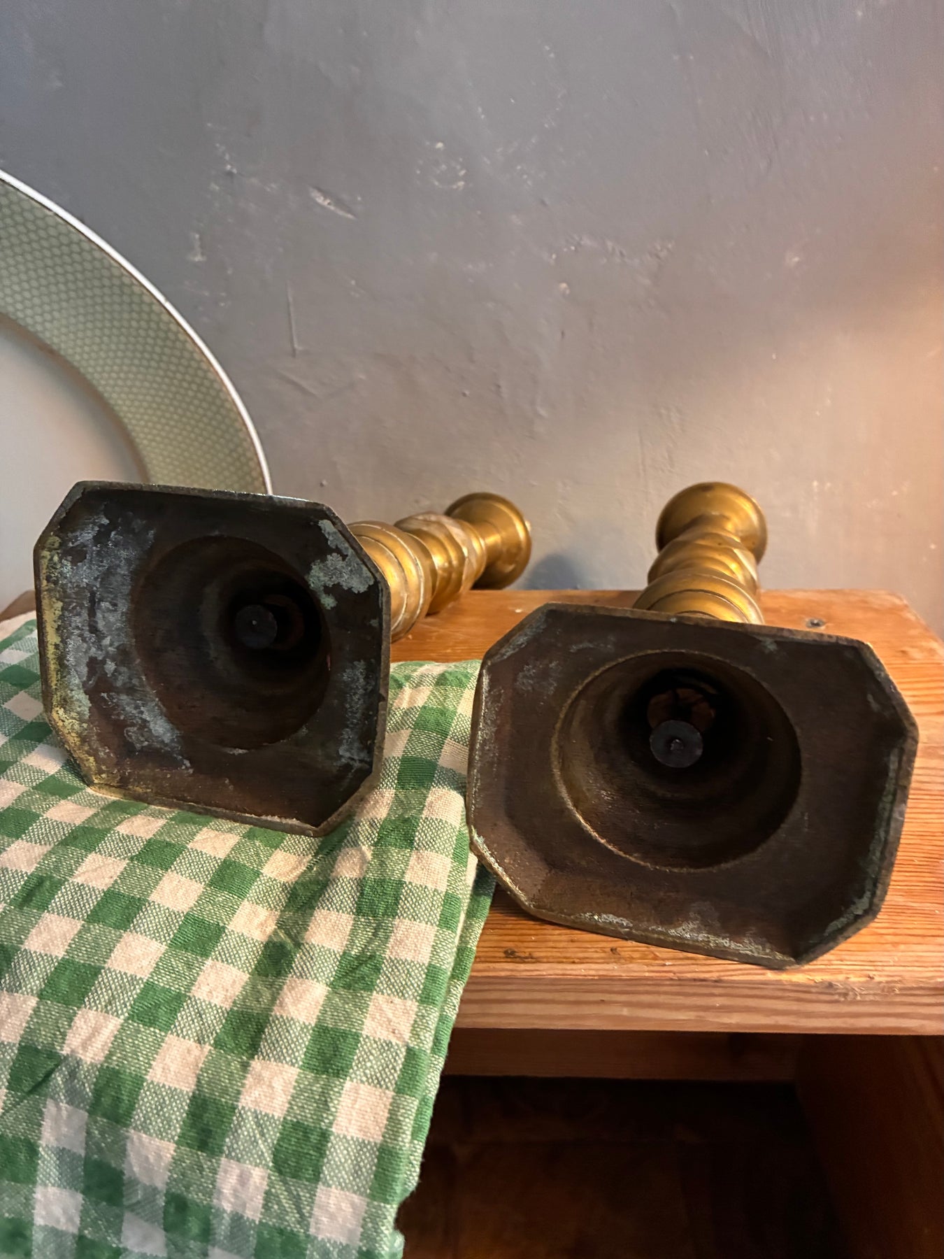 There is some age spotting on this pair, and I have found I need to keep tightening the base to the top when I handle them, but nothing that affects the overall character and appeal of this pair of candle holders