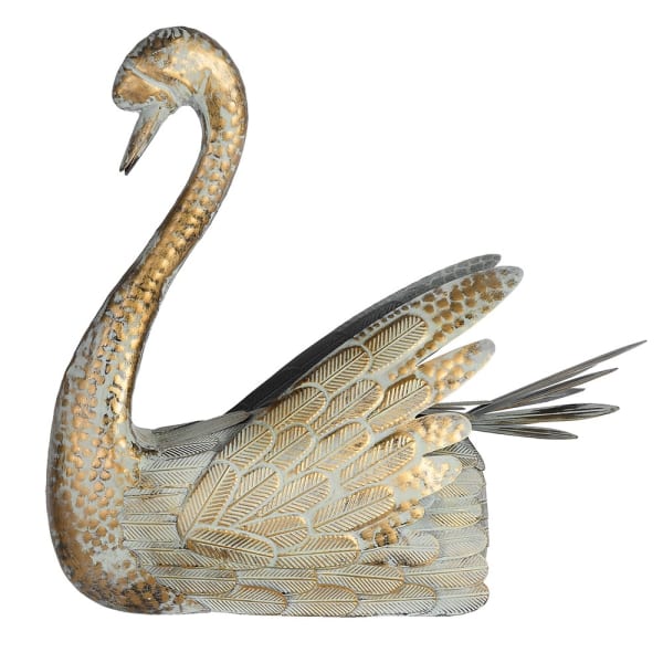 The Regal Verdigris Decorative Swan boasts a striking greenish patina mimicking old brass that instantly captures your attention.